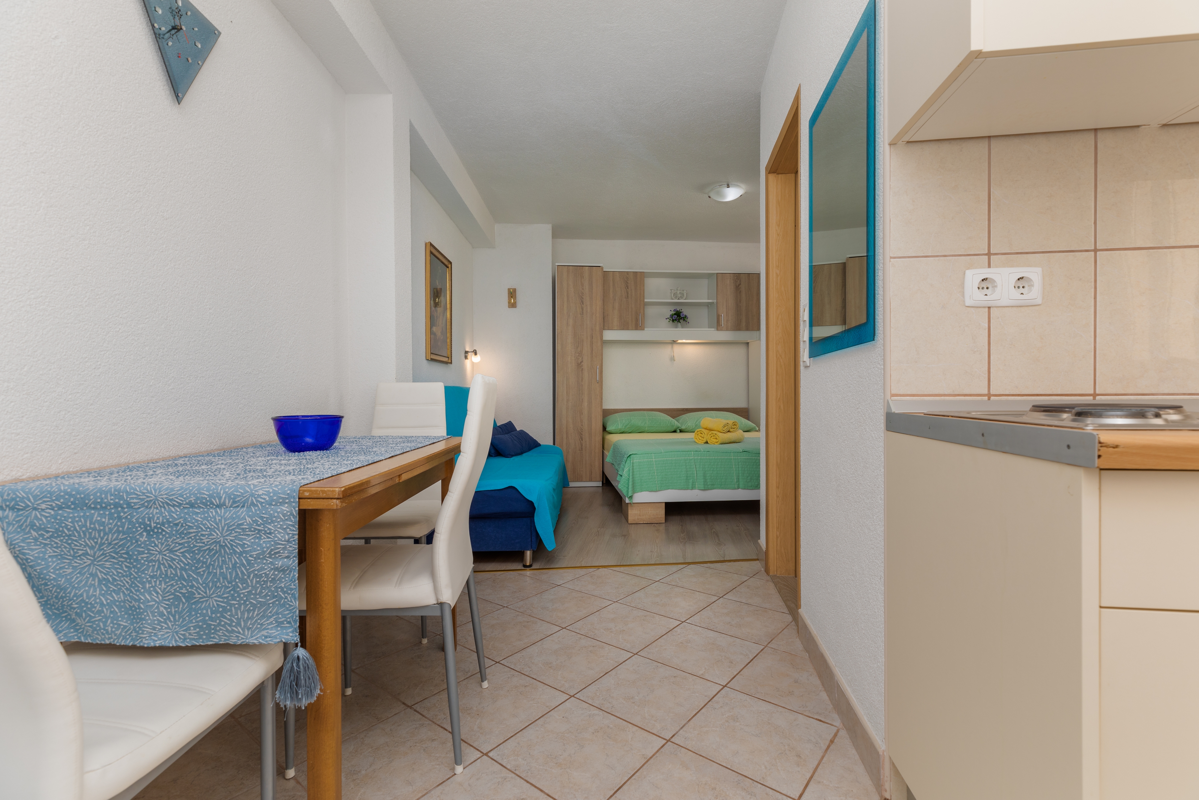 Studio flat can accommodate 2 guests. Beds are situated in 1 sleeping rooms, within 22m2. Guests can use a private balcony to enjoy the warm summer evenings. The studio offers the sea view. INCLUDED IN THE PRICE: tourist tax, final cleaning, air-conditioning, parking, internet. The availability of additional services for your chosen dates of stay, as well as their prices (if none are listed) must be checked ahead of time. Any additional services not shown in the price calculation are payable directly to the property owner and only if used by the visitor.