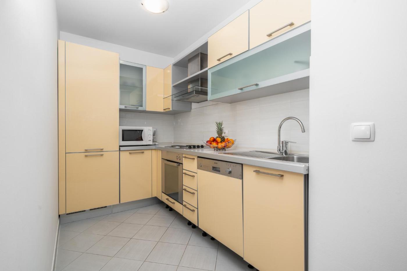 Apartment. This air-conditioned apartment comes with 1 living room, 1 separate bedroom and 1 bathroom with a bath or a shower. The well-fitted kitchen has a stovetop, a refrigerator, a dishwasher and kitchenware. Boasting a balcony with sea views, this apartment also features a washing machine and a flat-screen TV with satellite channels. The unit has 2 beds.