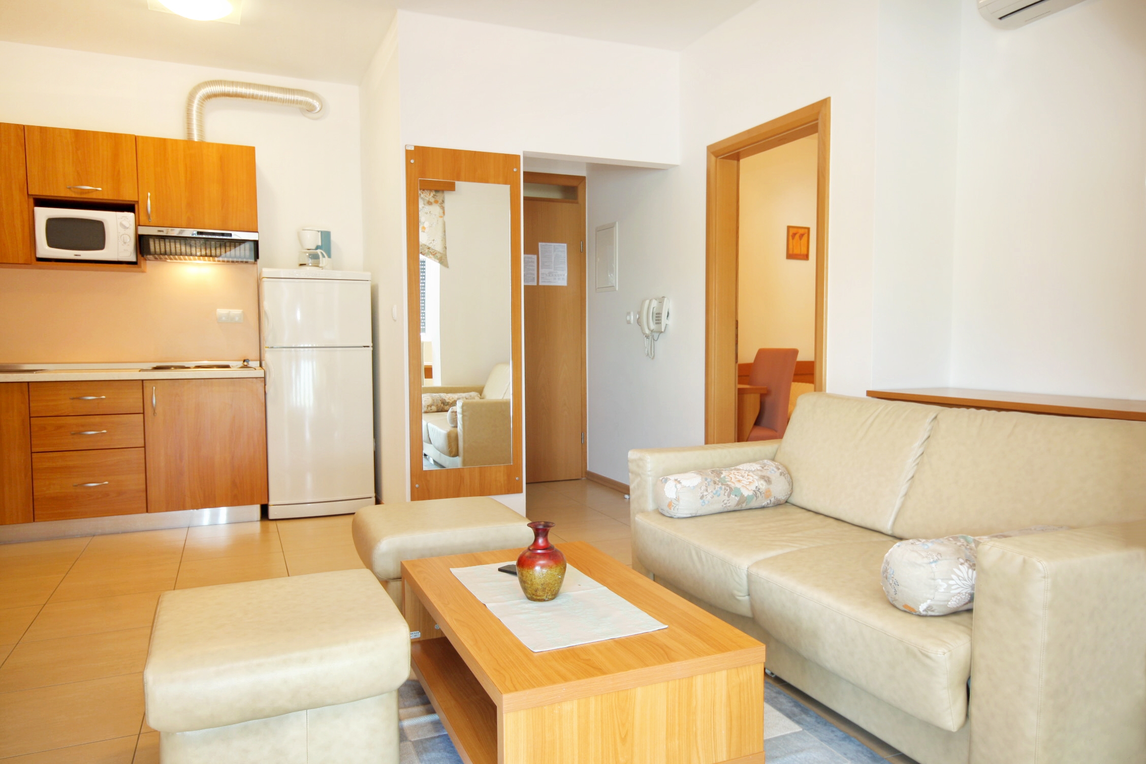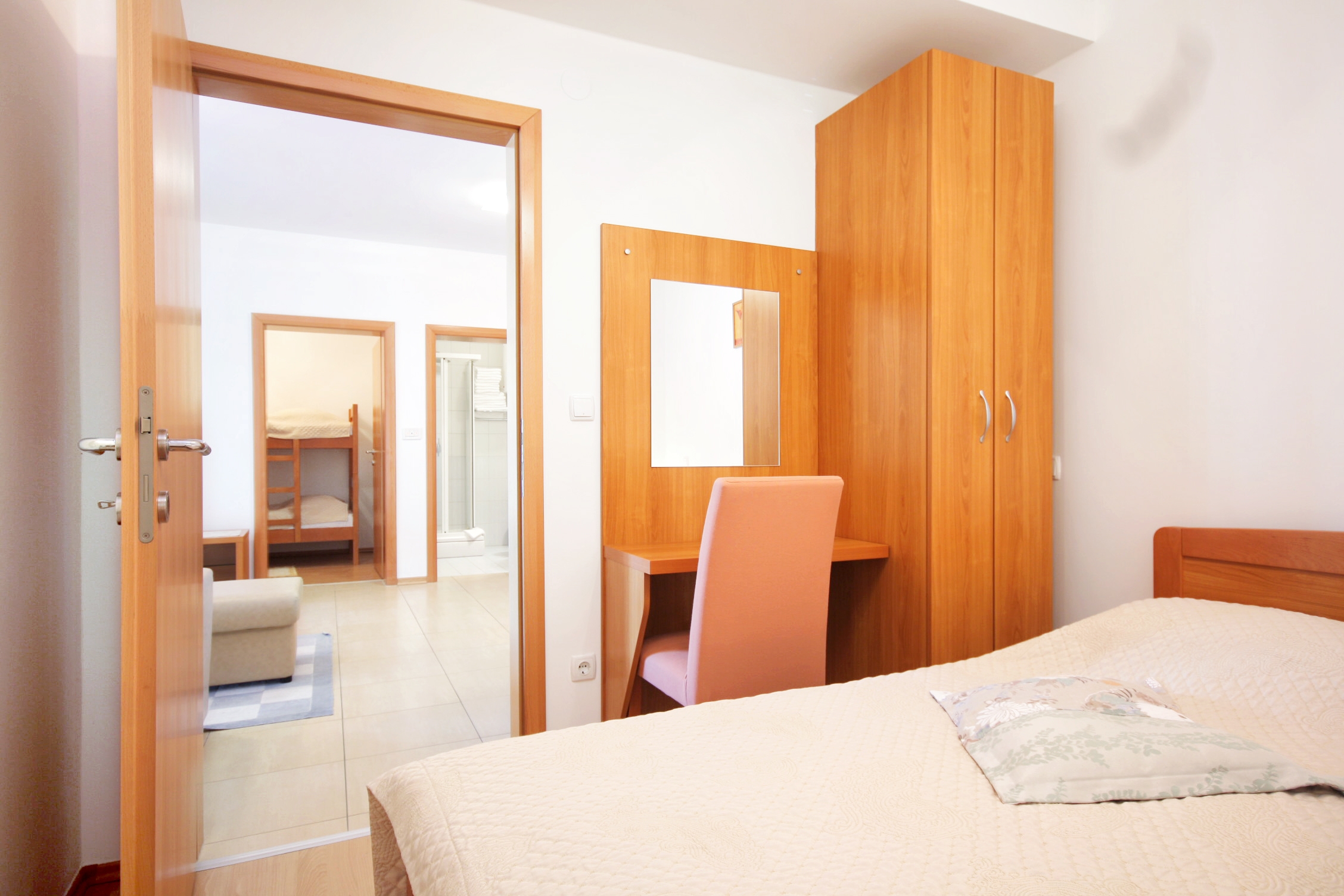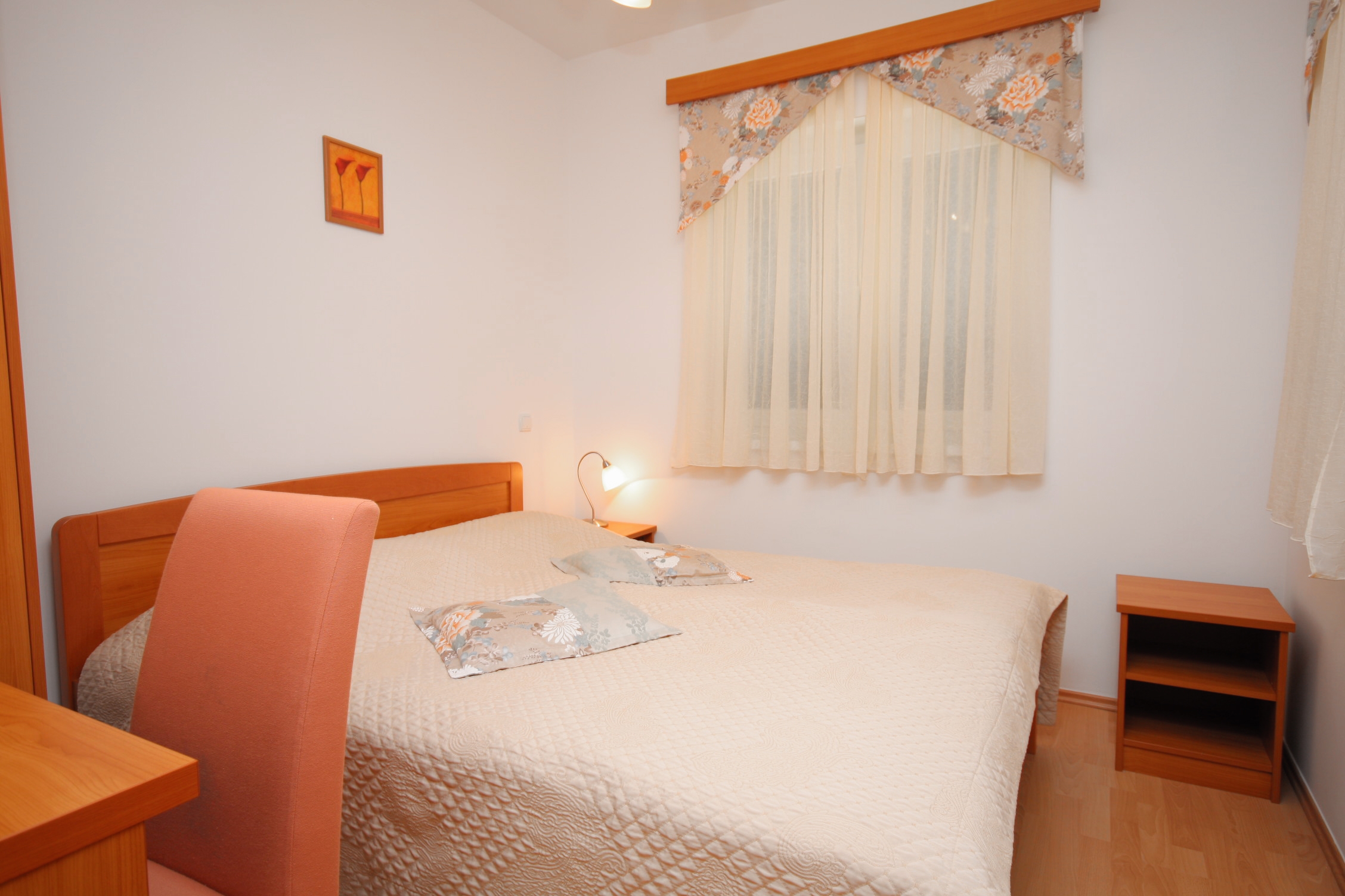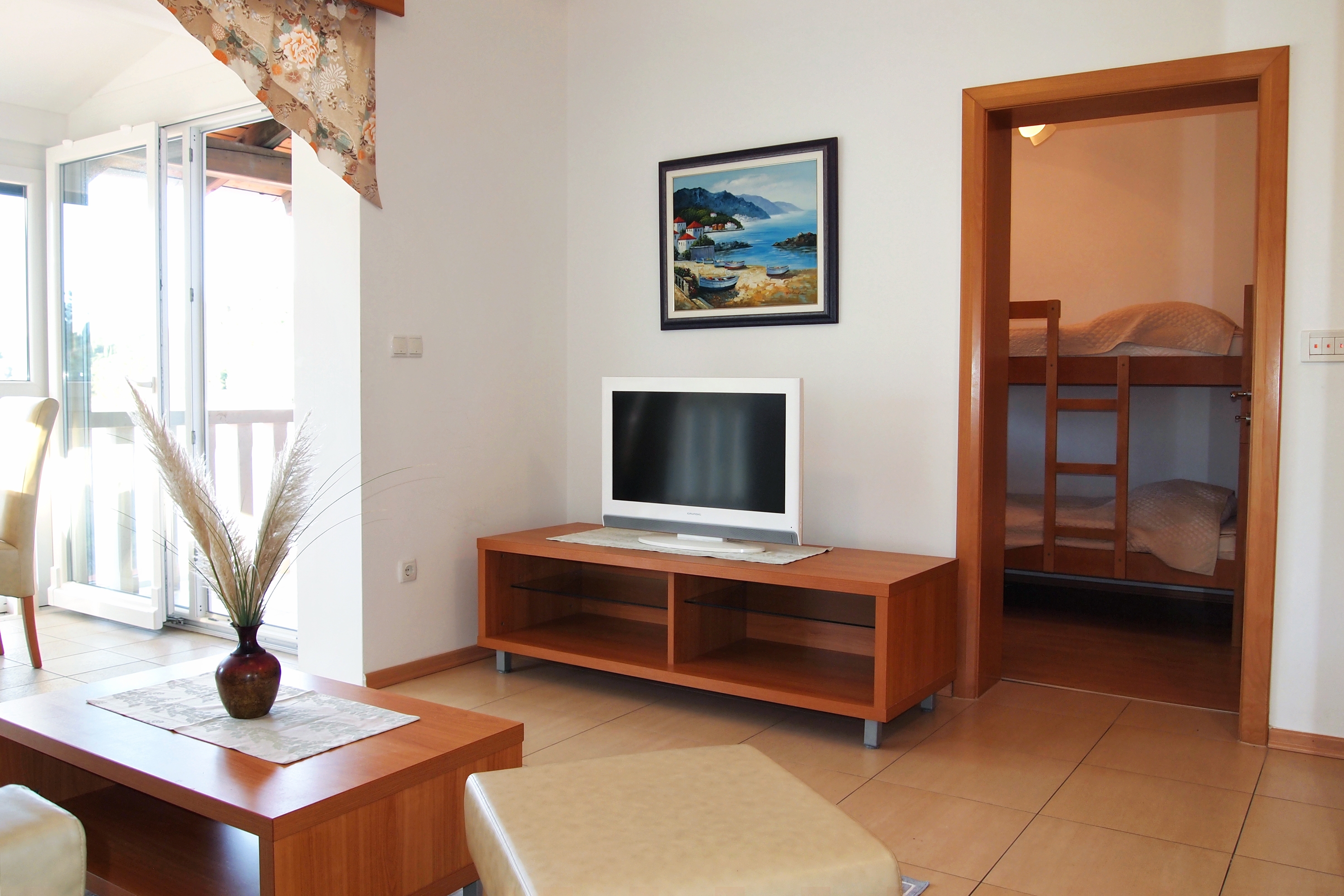 Apartment can accommodate 6 guests. Beds are situated in 2 sleeping rooms, but also in the living room, within 42m2. Guests can use a private terrace to enjoy the warm summer evenings. The apartment offers the sea view. Food can be prepared using barbecue which is shared with other guests too. Shared pool is on disposal during stay. For the booked accommodation unit the deposit is paid directly to the owner upon check-in (deposit amount is displayed on the website) INCLUDED IN THE PRICE: final cleaning, air-conditioning, pool, parking, internet, hairdryer. OBLIGATORY ADDITIONAL COSTS: tourist tax (adults €0.93 - €1.90 nightperson, discount for children aged 12 - 17), deposit (€100.00 one-time payment). The availability of additional services for your chosen dates of stay, as well as their prices (if none are listed) must be checked ahead of time. Any additional services not shown in the price calculation are payable directly to the property owner and only if used by the visitor.