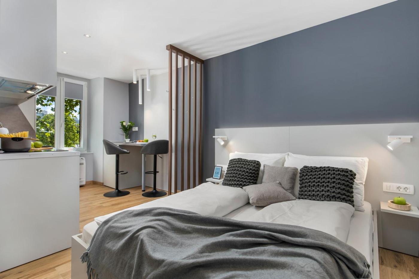Deluxe Studio. Offering free toiletries, this studio includes a private bathroom with a walk-in shower and a hairdryer. The well-equipped kitchen features a stovetop, a refrigerator, a dishwasher and kitchenware. The air-conditioned studio offers a flat-screen TV with streaming services, a private entrance, soundproof walls, a tea and coffee maker as well as city views. The unit offers 1 bed.