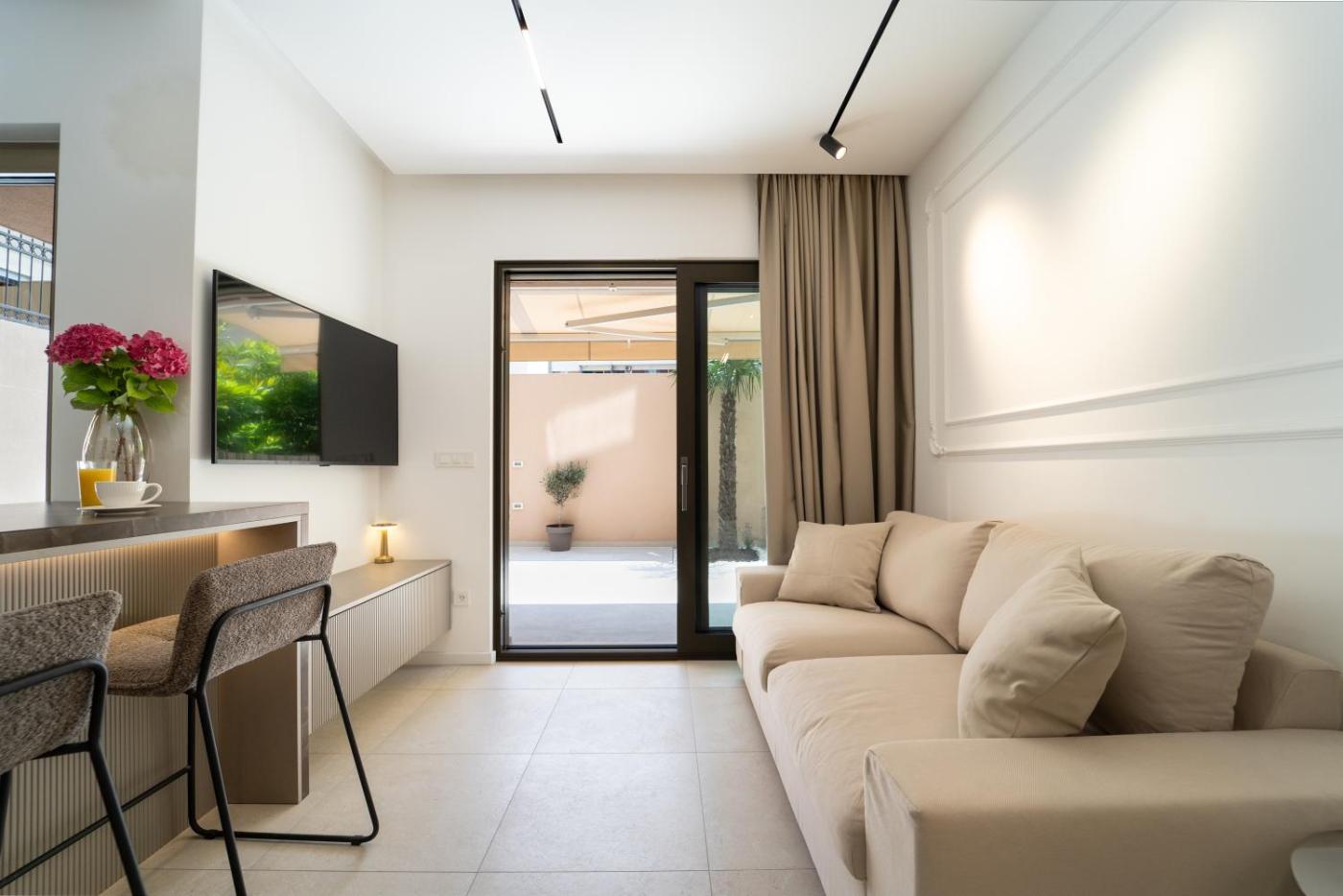One-Bedroom Apartment. Boasting a private entrance, this air-conditioned apartment comes with 1 living room, 1 separate bedroom and 1 bathroom with a walk-in shower and a hairdryer. Guests can make meals in the kitchen that features a stovetop, a refrigerator, a dishwasher and kitchenware. Featuring a terrace with garden views, this apartment also features a washing machine and a flat-screen TV. The unit has 2 beds.