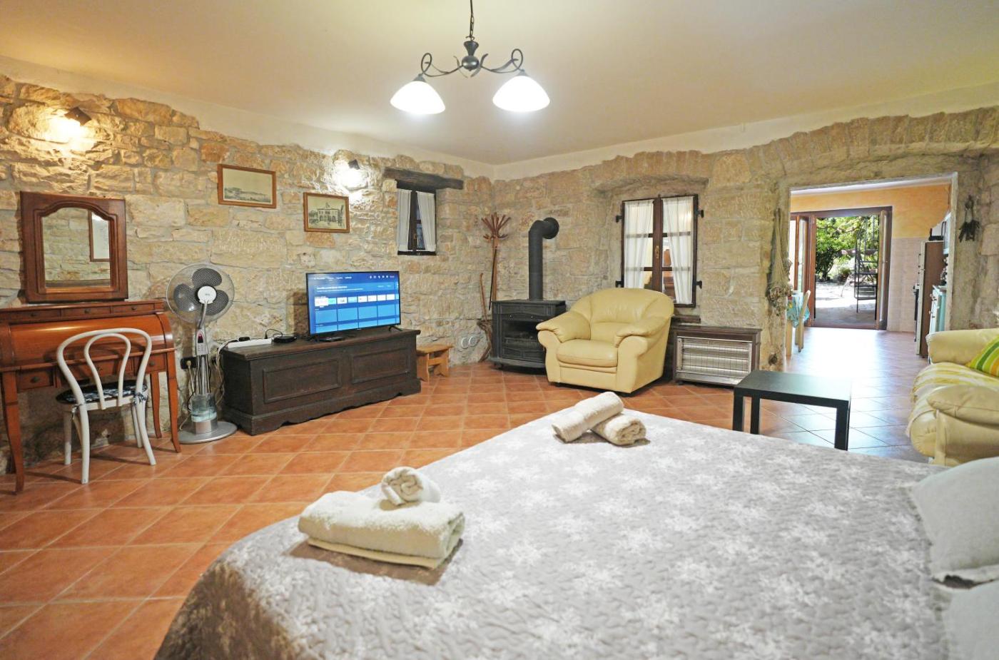 One-Bedroom Apartment. The fireplace is a top feature of this apartment. Boasting a private entrance, this apartment comes with 1 living room, 1 separate bedroom and 1 bathroom with a shower and a hairdryer. Guests will find a stovetop, a refrigerator, kitchenware and an oven in the fully equipped kitchen. The apartment also includes a barbecue. Featuring a terrace with garden views, this apartment also features a tea and coffee maker and a flat-screen TV with cable channels. The unit has 2 beds.