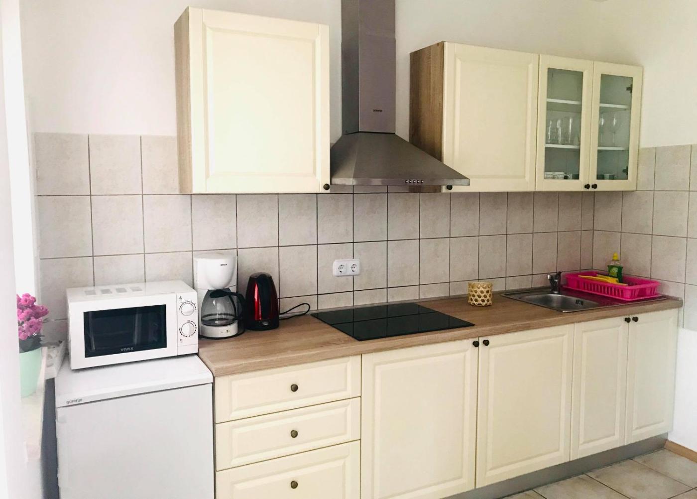 The apartment provides guests with a terrace, garden views, a seating area, satellite flat-screen TV, a fully equipped kitchen with a microwave and a toaster, and a private bathroom with walk-in shower and a hair dryer. A fridge, a stovetop and kitchenware are also provided, as well as a coffee machine and a kettle. At the apartment complex, each unit is equipped with bed linen and towels.
