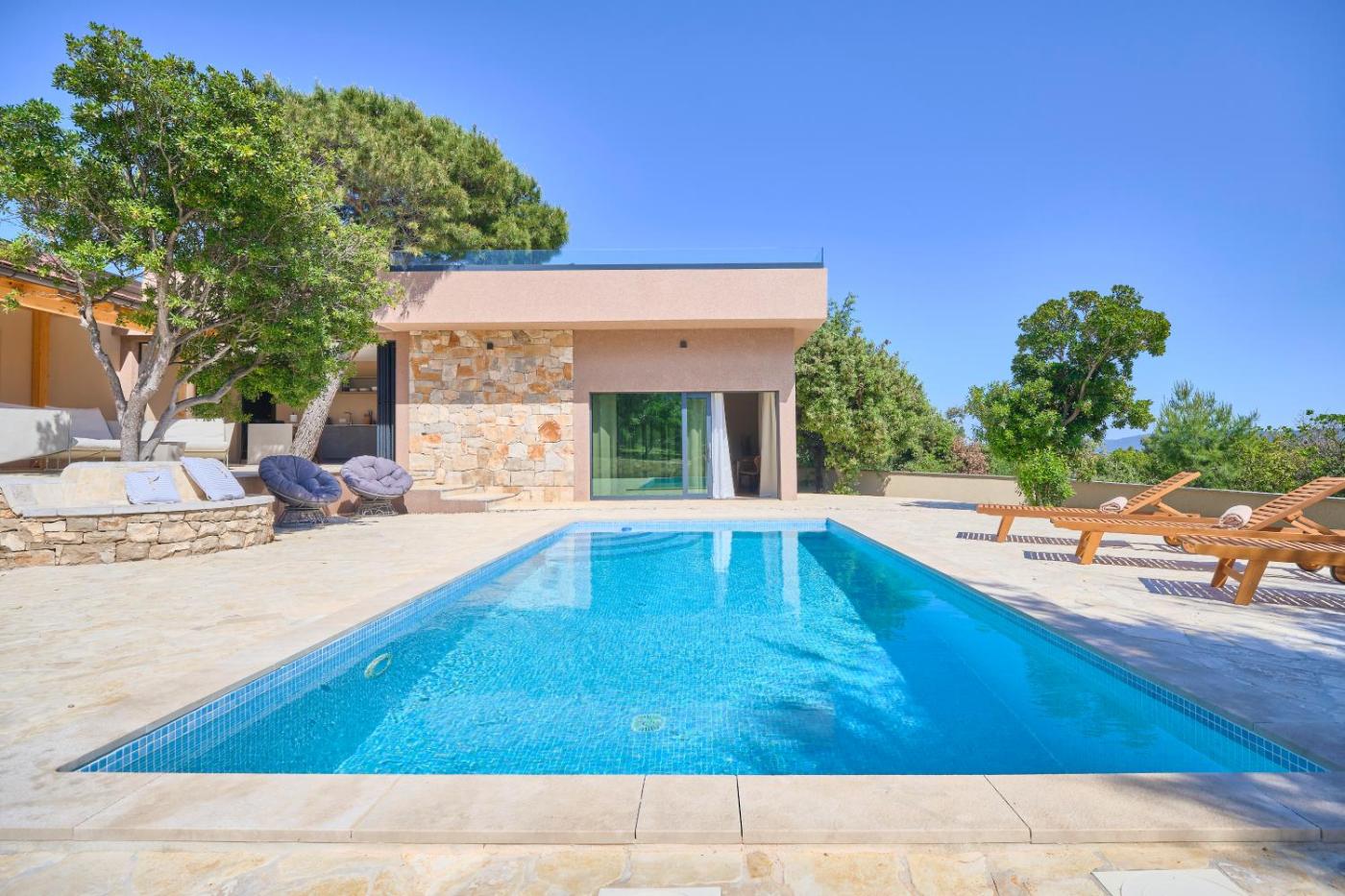 Two-Bedroom House. This holiday home features a pool with a view and a sauna. Boasting a private entrance, this air-conditioned holiday home features 1 living room, 2 separate bedrooms and 2 bathrooms with a walk-in shower and a hairdryer. Guests will find a stovetop, a refrigerator, a dishwasher and kitchenware in the well-equipped kitchen. The holiday home also comes with a barbecue. Featuring a terrace with sea views, this holiday home also features a washing machine and a flat-screen TV. The unit has 4 beds. ;