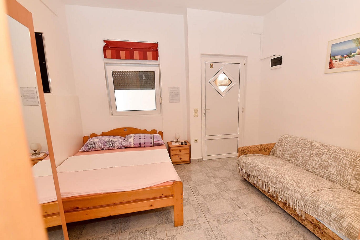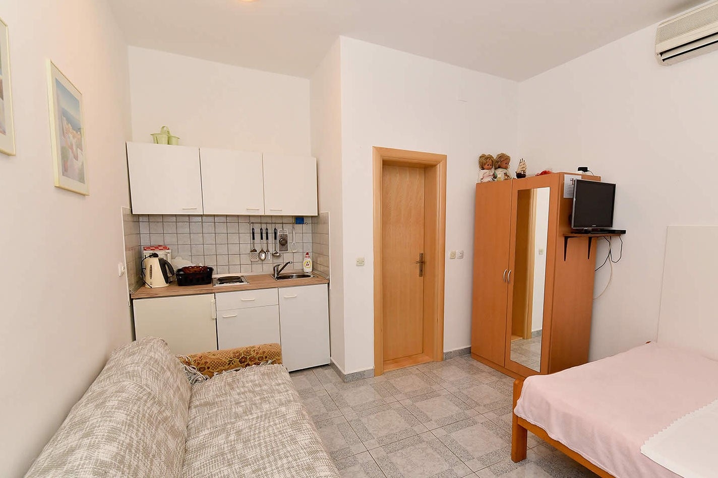 Studio flat can accommodate 3 guests. Beds are situated in 1 sleeping rooms, within 16m2. Guests can use a private terrace to enjoy the warm summer evenings. Food can be prepared using barbecue which is shared with other guests too. This accommodation unit welcomes pets at an additional charge. INCLUDED IN THE PRICE: tourist tax, final cleaning, air-conditioning, parking, internet, baby cot, iron, ironing board, hairdryer, sunshade, sunchairs. OBLIGATORY ADDITIONAL COSTS: short stay fee (surcharge depending on a number of booked nights: 30% - 1, 20% - 2, 10% - 3). OPTIONAL ADDITIONAL COSTS: laundry (€10.00 washing), pets (€5.00 per night). The availability of additional services for your chosen dates of stay, as well as their prices (if none are listed) must be checked ahead of time. Any additional services not shown in the price calculation are payable directly to the property owner and only if used by the visitor.
